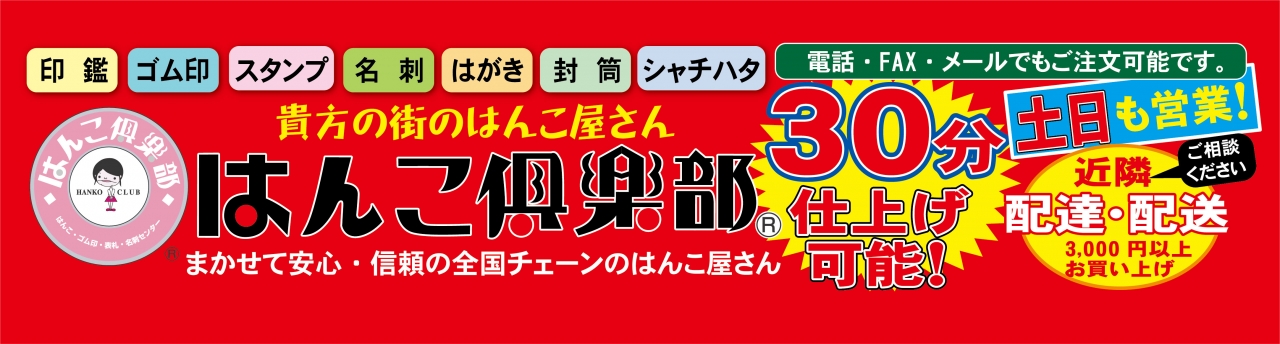 お急ぎの実印、銀行印、認印は30分で仕上げる事も可能ですのではんこ倶楽部松山朝生田店に一度ご相談ください!印鑑は松山最安値に挑戦中です。他店よりも高い場合は店頭にてその旨お伝えください。徹底的にお安く提供いたします。はんこ倶楽部松山朝生田店は全国展開を行っている「はんこ倶楽部グルーブ」に加盟しておりますのでどなた様も安心してお求めいただけます。【印鑑】【ゴム印】【スタンプ】を中心に取り扱っております。また、皆様の多彩なニーズにお応えできる様、【名刺印刷】【はがき印刷】【封用印刷】【ポスター印刷】【チラシ印刷】【年賀状印刷】【縁起札彫刻】【プレート彫刻】【表札】等の幅広い商品を取り揃え皆様のご来店をお待ちしています。